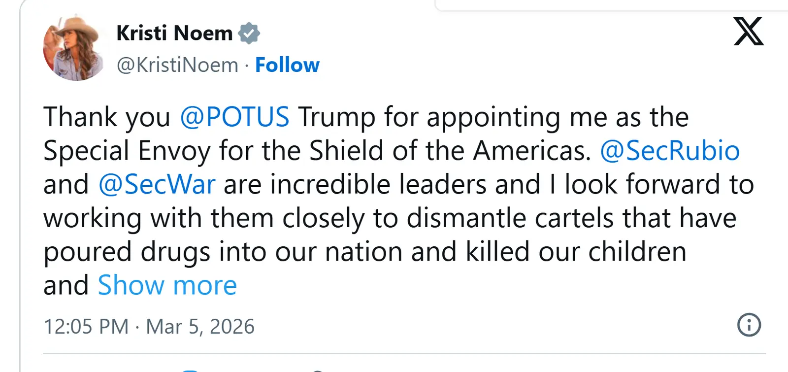 I am including a link to show that Kristi Noem thanked President Trump for her promotion.