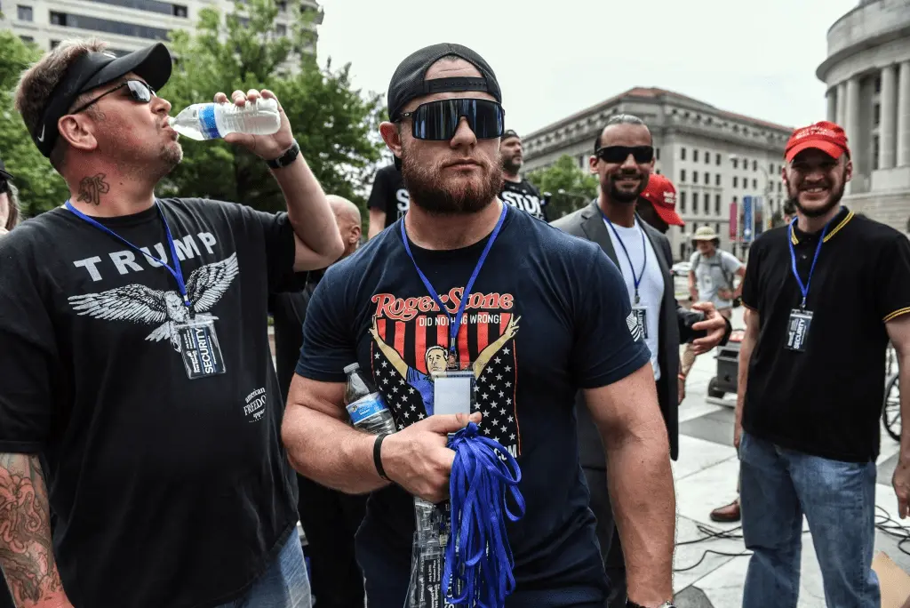 Bertino wore a patch with the letters “R-W-D-S” — short for “right-wing death squads.” Mass killing of political opponents is a theme widely promoted by Proud Boys and other far-right extremists who celebrate Chilean dictator Augosto Pinochet’s grisly practice during the 1970s of disappearing opposition activists by dropping them out of helicopters.