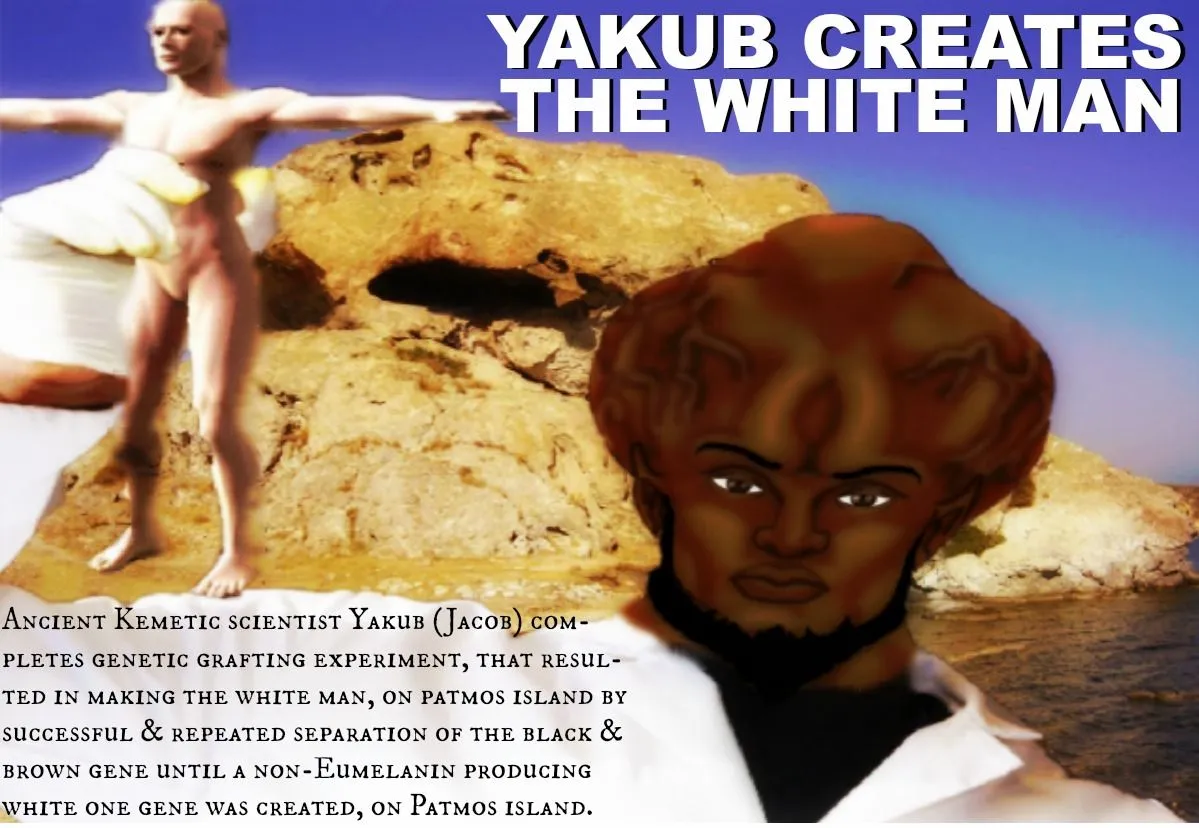 6,000 years ago, a black scientist by the name of Yakub created white people using a process known as grafting. Within 6 months these "albanoid" people were causing chaos so the king banished them across the burning sands to the frigid caves of Europe. There, the albanoids engaged in degenerate practices such as homosexuality and cannibalism. They mated with wolves who became their friends. Eventually Moses arrived to civilize the albaniods, but once they were out of their caves, they began to rampage across earth, laying waste to everything in their path.