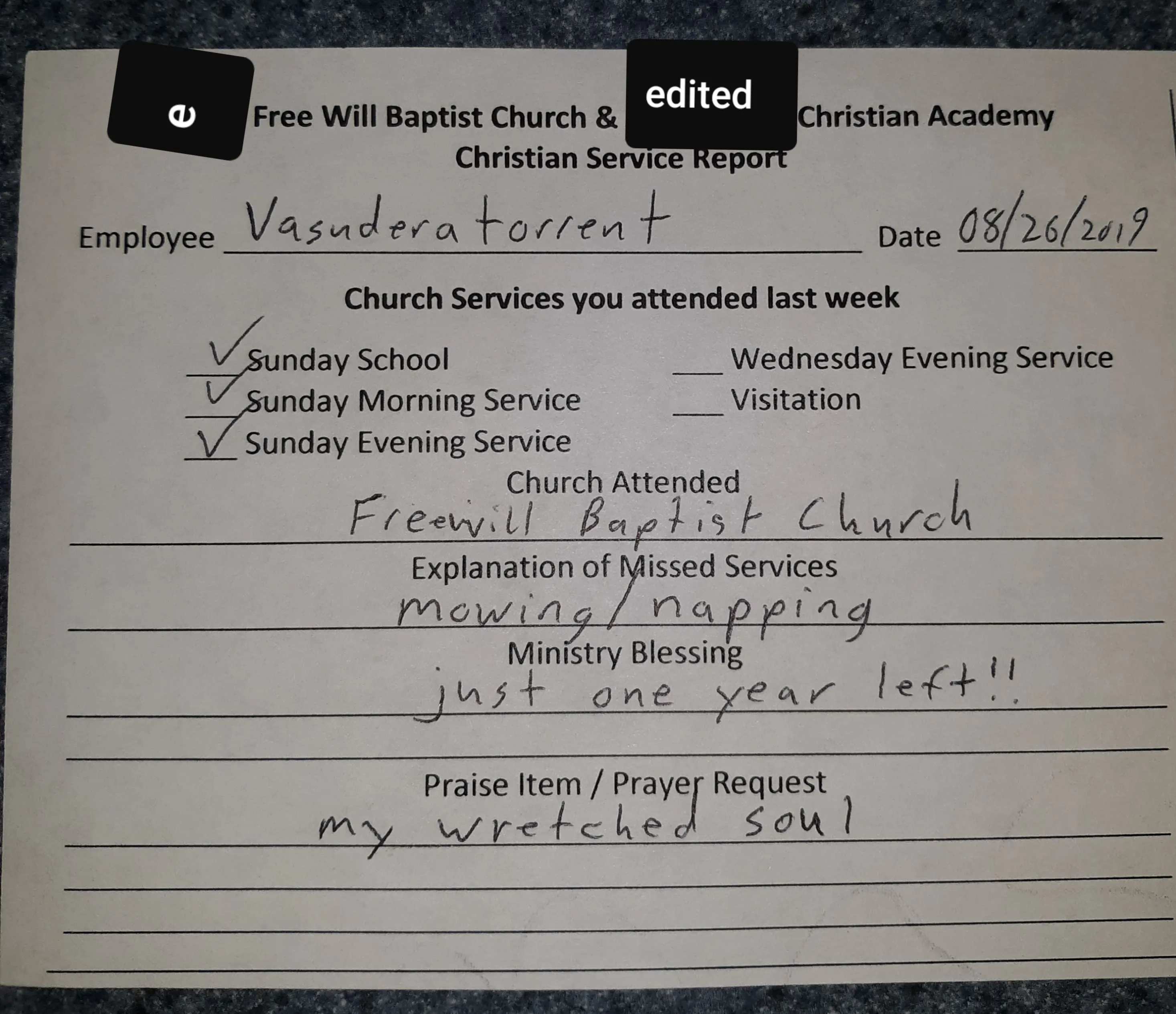 I turn in my church attendance form on Monday.