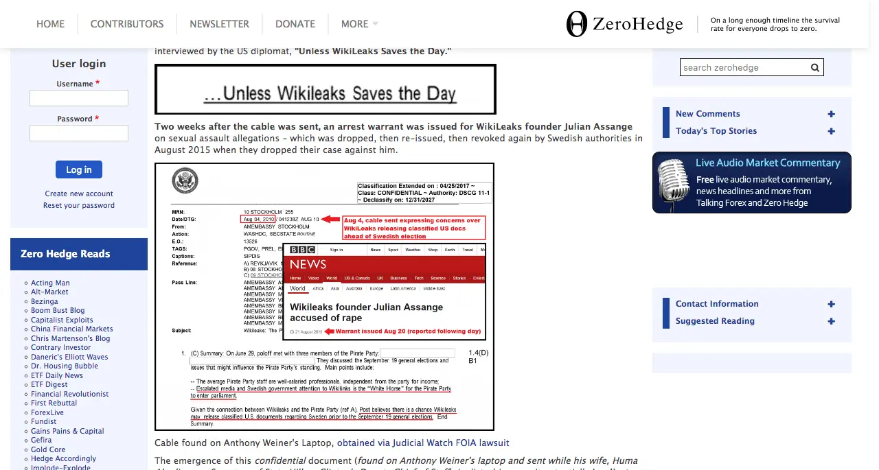 A confidential document found on Anthony Weiner’s laptop reveals that the United States Embassy in Stockholm, Sweden expressed concerns in 2010 that WikiLeaks would release classified US documents related to Sweden ahead of the September 19 Swedish election, tipping the vote towards the Pirate Party. The subject of the cable reads “Wikileaks: The Pirate Party’s White Horse Into Sweden’s Parliament?”