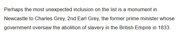 From the article though and to illustrate this is actually about Neo-Communists and Imported African and Mooselimb POS just wanting to DESTROY British history to replace it with ALTERNATIVE history, Charles Grey monument on the list and what did his Government do? Oversaw the abolition of slavery.