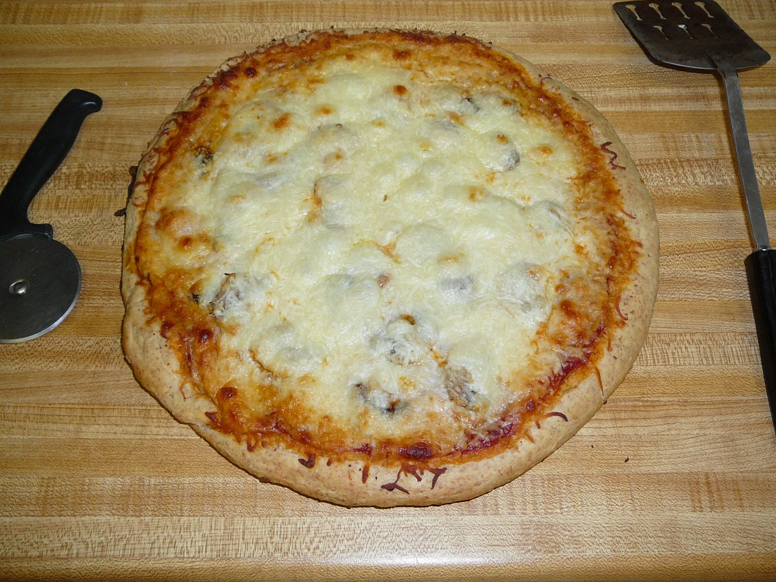 Ah, yes, I had my baking muse singing to me tonight. I whipped up an home-made pepperoni & mushroom pizza on a blended whole wheat crust. Nummies!