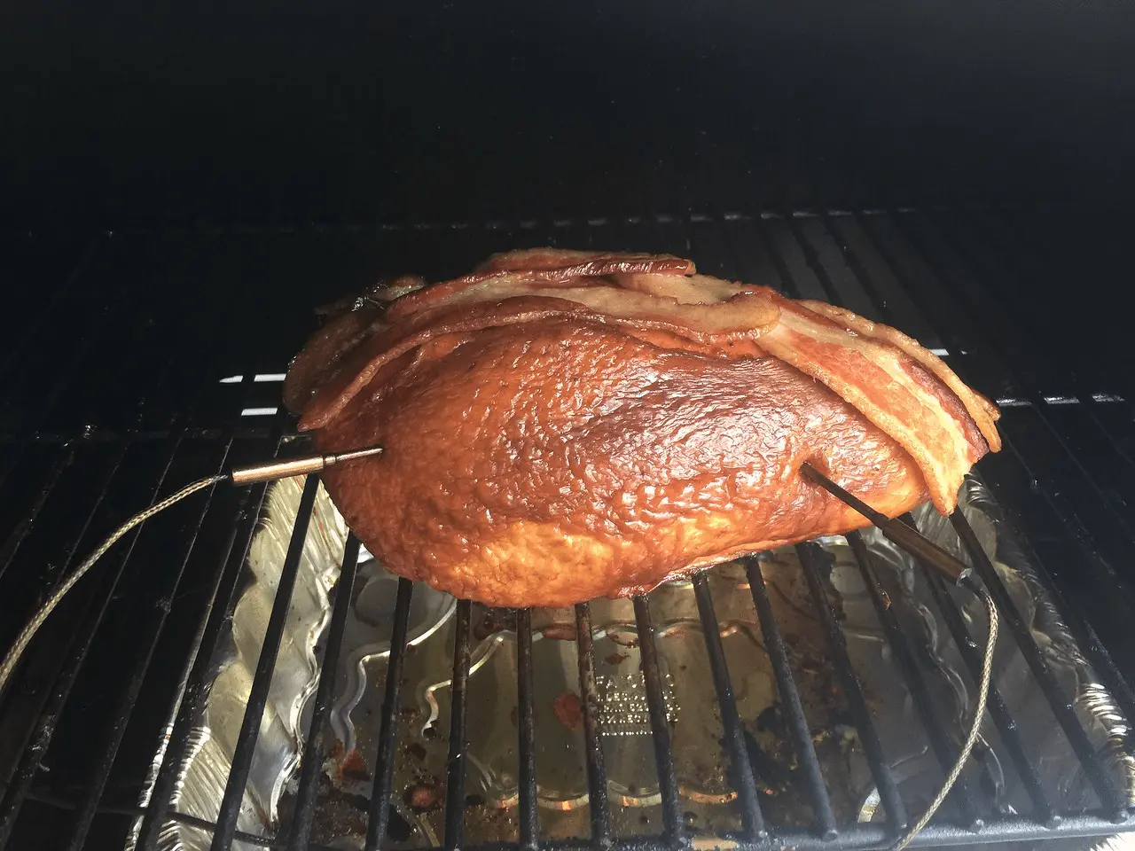 Used a little bacon to cover the skinless part to stop it from drying out,plus a lot of spritzing with apple juice to keep the temps down on the thin side.