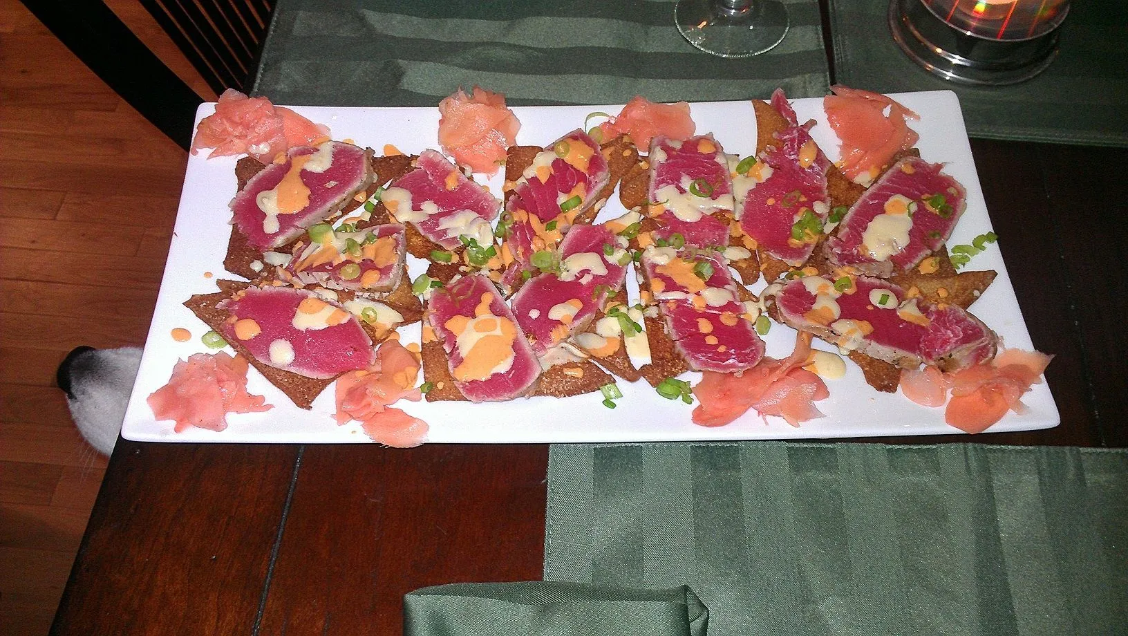 I cut wonton skins into triangles deep fry them and the dust them with chili salt. I lay the tuna on top and drizzle with wasabi cream and garnish with scallions and pickled ginger