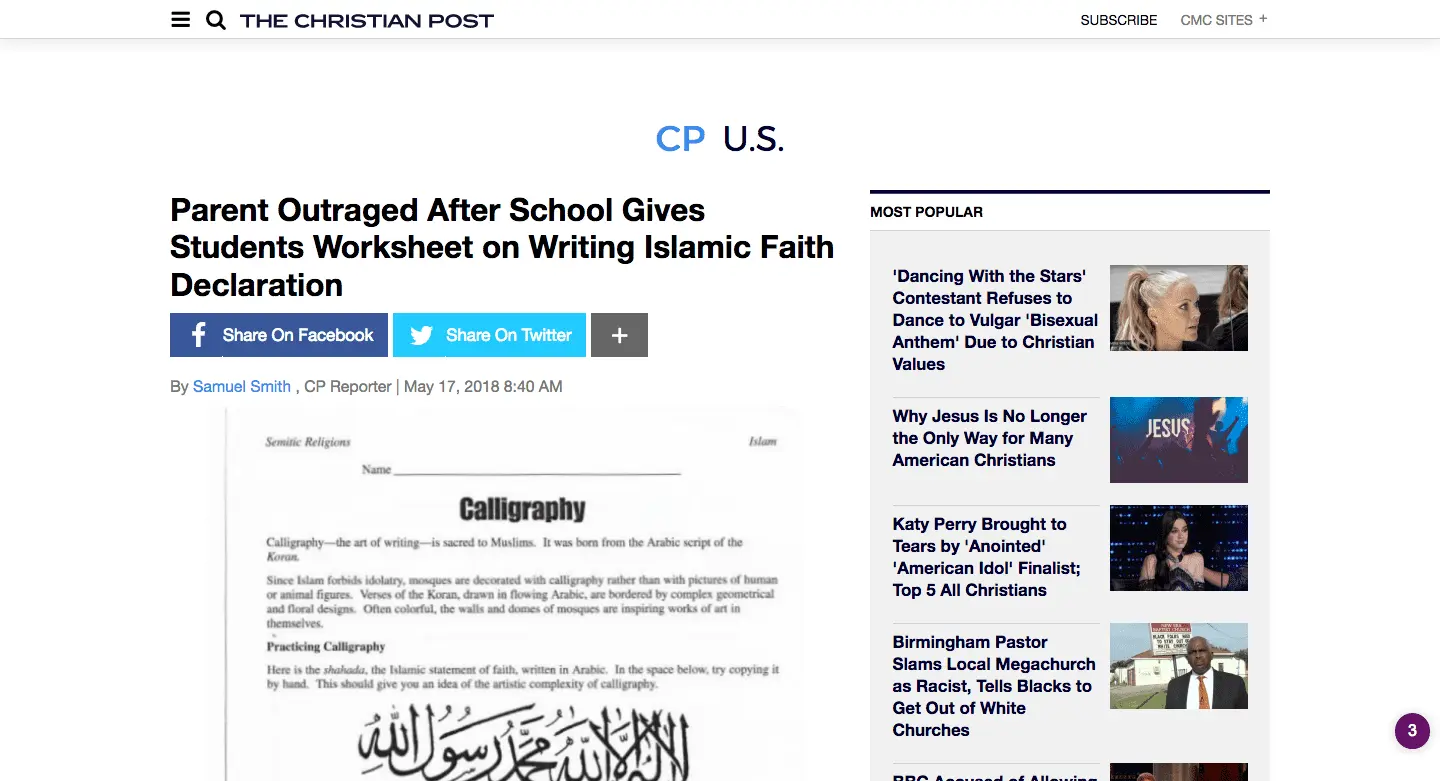 Seventh-graders at a West Virginia public school were asked to write the Islamic declaration of faith in Arabic calligraphy in a social-studies class, drawing outrage from a Christian parent. Parent Rich Penkoski contacted Principal Ron Branch at Mountain Ridge Middle School in Gerrardstown about the assignment, which was part of a world-religions unit, the Christian Post reported.