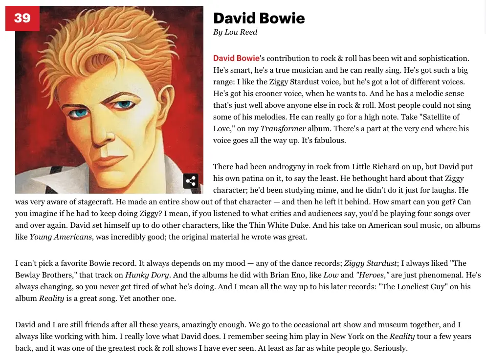 Well, some PC knuckleheads have decided that David Bowie's song, "China Girl" is racist, THIRTY SEVEN YEARS after it was first released. This is totally ludicrous. If you listen to the lyrics, his "China Girl" is praised, and being loved to the fullest. The song, that was actually co-written by Iggy Pop, in, I believe 1977, is NOT racist. This is just more bullshit from the PC crowd. Anyway, here are a few of my favorites by Mr. Bowie - 1) Heroes, my absolute favorite song by him, it features wonderful guitar by the great Robert Fripp, and amazing keyboard and synthesizer work by Brian Eno. Just a fantastic song. 2) Space Oddity, the song where we meet the enigmatic Major Tom. This was Bowie's first big hit in the UK, and became a sizable hit in the US some years later. Wonderfully atmospheric song. 3) Blackstar, the lead-in title song on Bowie's last studio album, this one is MORE than just a song. I'd call it "musical theater". It's beautiful, sad, and eerie, and just an amazing send-off on his last album. Pure magic. 4) Suffragette City, my favorite "rocker" by Bowie, this is a key track from his legendary album, The Rise and Fall of Ziggy Stardust and the Spiders from Mars. This one just ROCKS. 5) China Girl, my favorite song from his hugely successful album, Let's Dance. This song has a great beat, catchy lyrics, and a wonderful video to go along with it. And it's NOT racist, in any way. So here are my 5 favorites by Mr. Bowie, what are some of yours?