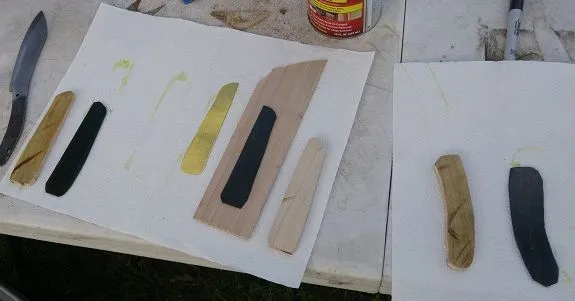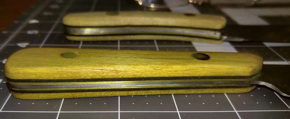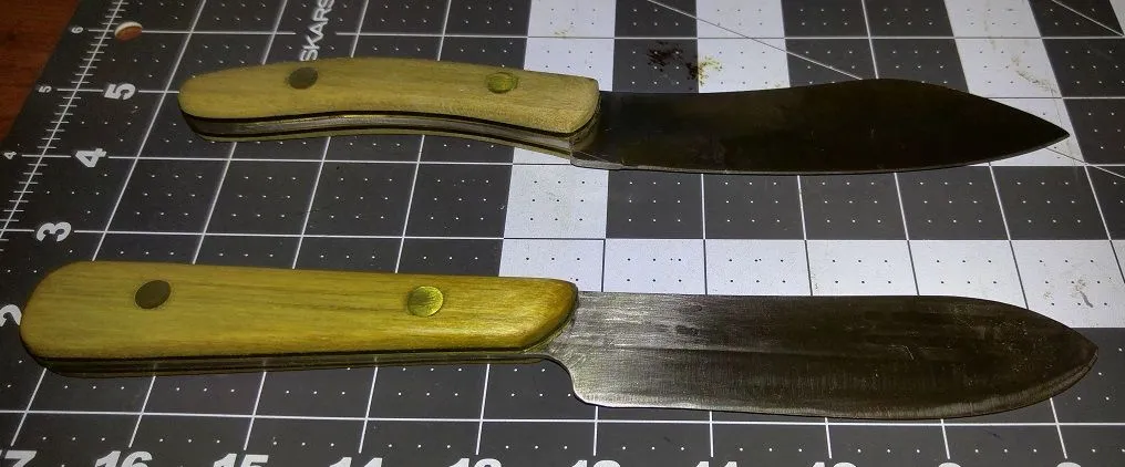 "Made" my first knife this fall. It's actually a reprofiled vintage 8" Ontario Slicer in 1095 carbon steel cut with a Dremel, quenched often to retain heat-treatment. The new profile is based on the Canadian Belt Knife. The example pictured is my Cold Steel CBK. While it is a very practical knife, the CS is not full tanged, and the Grohmann that it is based on it a minimum of $100 new. So I made my own. The handle I cut and shaped from seasoned oak with a stain that was made from boiled black walnut hulls. The rivets are repurposed from the original Onterio Knife.