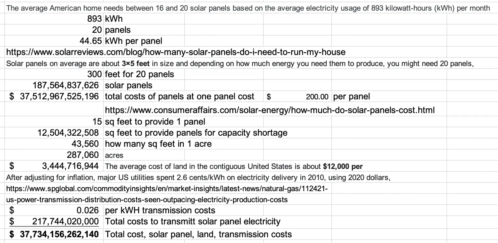It will require $37.734 TRILLION and 287,060 acres of solar panels to generate electricity to make up the 8.3 trillion kWh shortage.