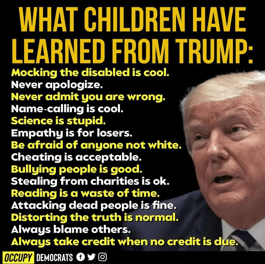 all of whom love trump and want their boys to grow up to wear high heels and manicures and make up like dear leader.Children don't learn from Trump, they learn from their parents, social media and the messed up schools they attend.