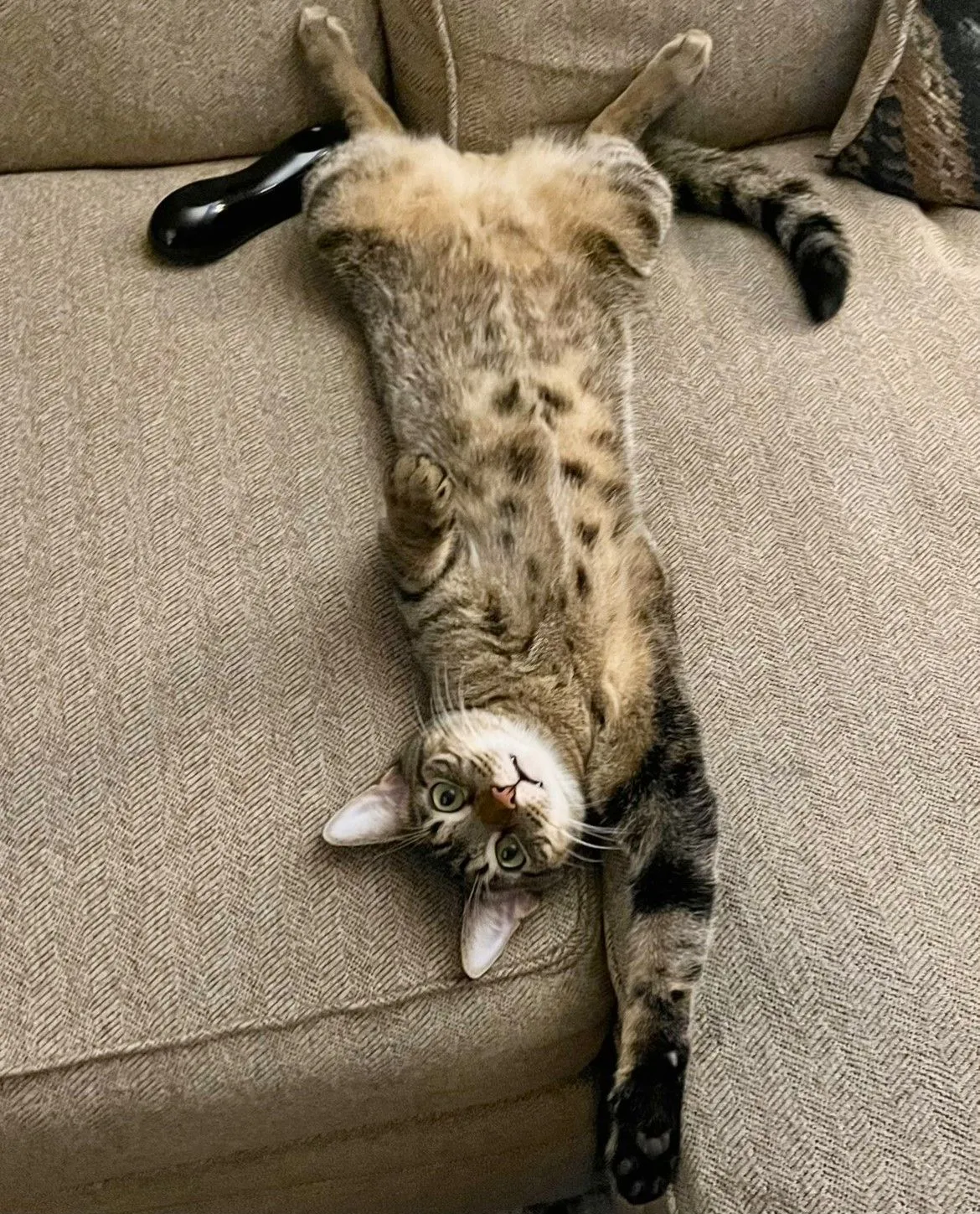 That cat is pretty shady, and bears watching, especially if walking past furniture or beds, as he hides underneath for sneak attacks.LOL He looks like he's saying "Can you hand me the remote? I'm all comfy. "