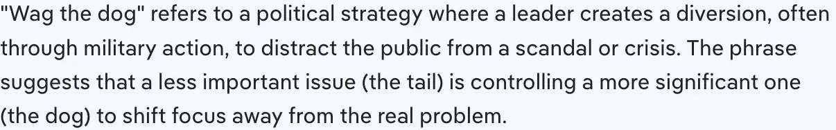 That describes a "red herring". "Wag the dog" refers to a minor element controlling a larger element of the same subject, such as a minor budget proposal controlling the destiny of the larger budget. Recently this might apply to the Obamacare subsidies that threaten to shut down the government.C.I.A. Conducted Drone Strike on Port in Venezuela