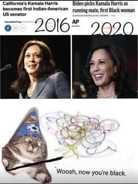 She's black and Asian. But here we see the racists doing what they do. Had Harris been a crackhead, she'd be black. So **** off, racist.She's Indian Asian. Pretending to be black LOL the perfect Democrat
