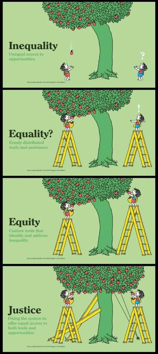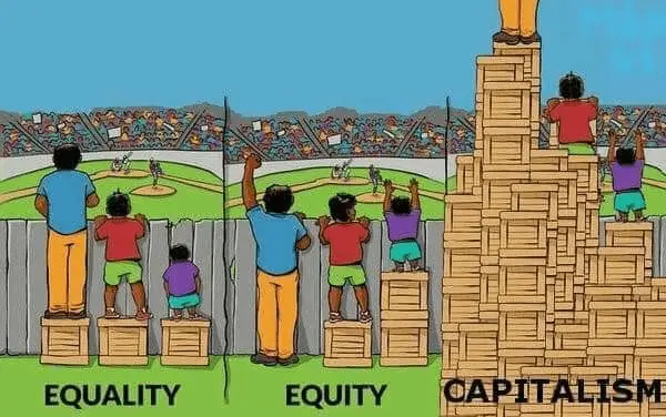 The picture is not about ball park tickets. The equality in the example is that all can attend if they wish, everyone is equal and can go. The fairness is provided by the park, they know that everyone is not equal and have different circumstances. So it provides adequate parking and access for both abled and disabled people, different seating arrangements, and is shown in the picture by providing adequate boxes for different height people to view the game.The graphic example is fallacious. The people who are LEGALLY in the ball park by virtue of purchasing a ticket have paid for the quality of seat that they chose. They were all given the same opportunity to purchase base line seats or nose bleed seats. The example that you provide seems to suggest that the lower priced tickets should get the higher priced positions. The fallacy in the graphic is that none of the three took the opportunity that was available and instead chose to steal the value. They did not avail themselves to the opportunity to purchase a seat.