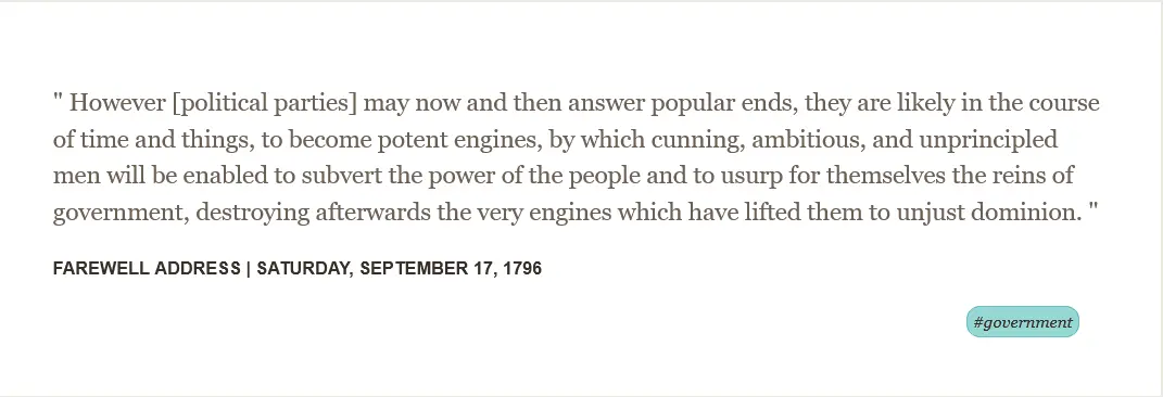 However [political parties] may now and then answer popular ends, they are likely in the course of time and things, to become potent engines, by which cunning, ambitious, and unprincipled men will be enabled to subvert the power of the people and to usurp for themselves the reins of government...www.mountvernon.org