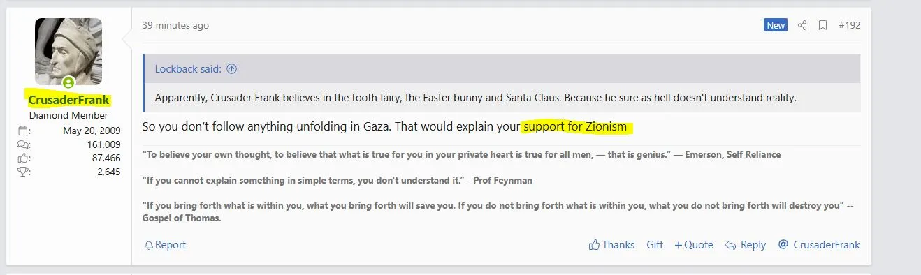 He did not criticize any specific Israel policy in that quote. He negated the very right of Jewish people to determine their own fate.I've known Frank for well over 20 years...We're practically brothers in arms....There's not an antisemitic or bigoted bone in that man's body.