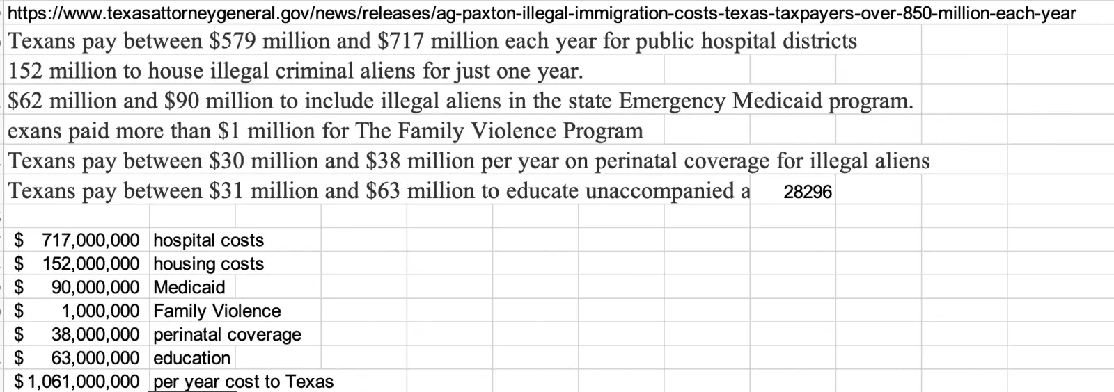 Which is why (atleast one of the reasons) illegals should just be shot.Direct cost to Texas to handle the illegal immigrants... $1.016 Billion a year!