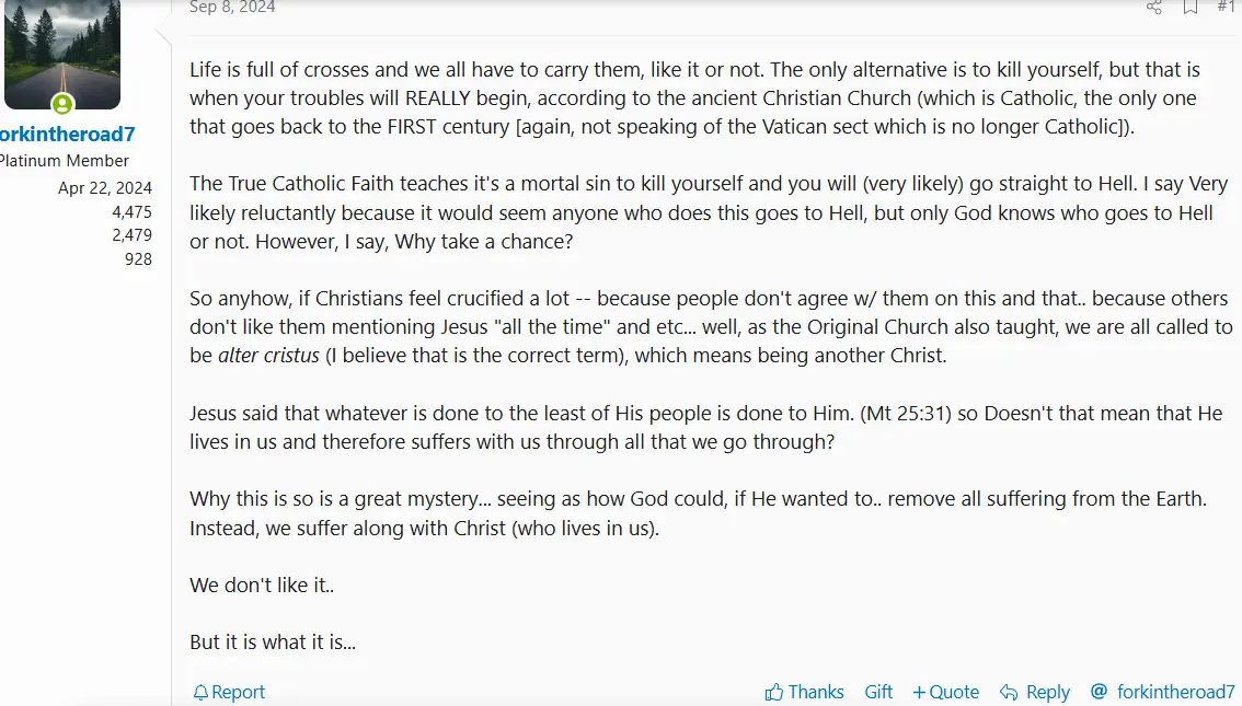 But the true Church marches on, though today it is a small remnant of what it used to be. The Vatican stopped being Catholic a LONG LONG time ago (something like 65 years ago)