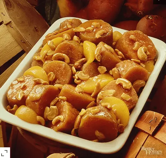 Yummy yummy yummy!Here's one I forgot about. Yams, peaches and cashews casserole. It's simple, put as many cans of drained yams and drained peaches as you like in a casserole dish. Cover with the amount of cashews you want. Sprinkle at least 1/4 cup brown sugar over it all and dot with butter, to your tastes. Cook at 350 for 30 minutes.