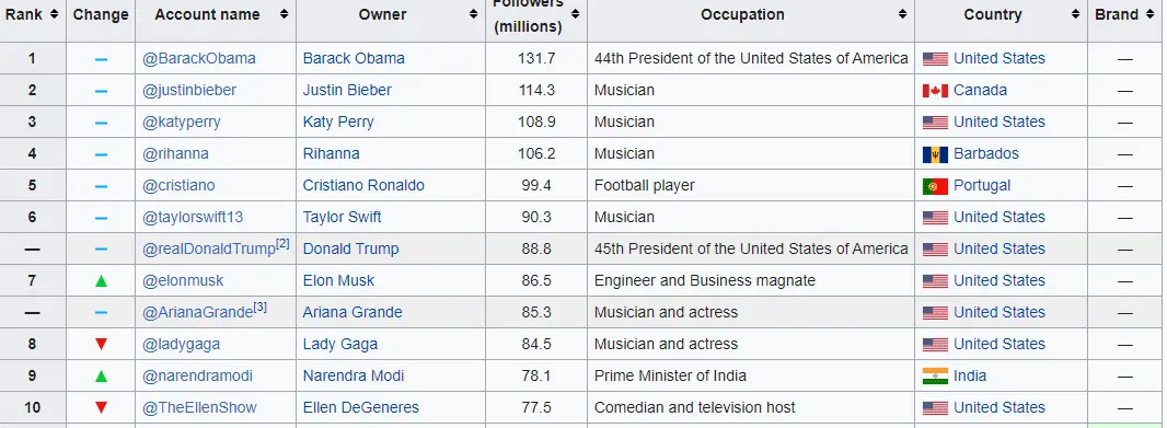 ROFLMAO, WIKIPEDIA for stats, yeah, that's where I go when I want a dependable source. Social Blade? WTF. Cosmo? Just where all the inquiring housewives and attic dwellers go for info. LOLList of most-followed Twitter accounts - Wikipedia