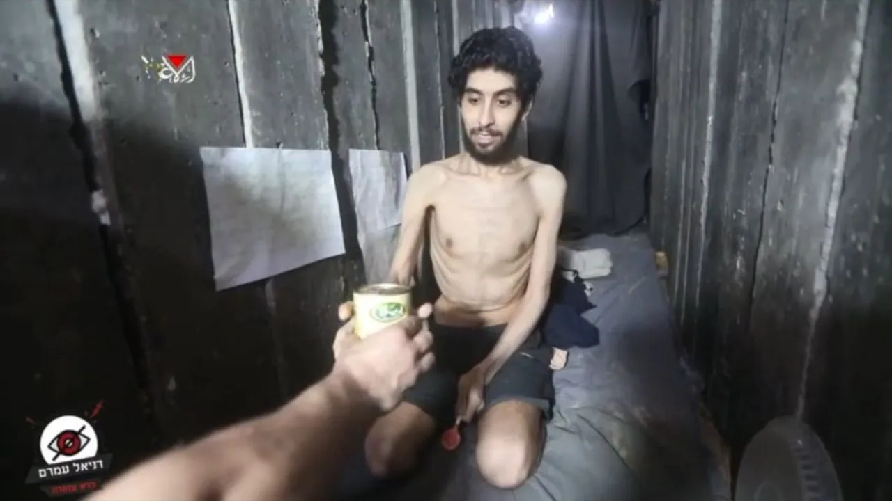 Hamas claims hostage Evyatar David shares meager rations with captors, but a well-fed terroristās hand caught on camera tells a different story; survivors and family denounce the starvation as sadistic propaganda.