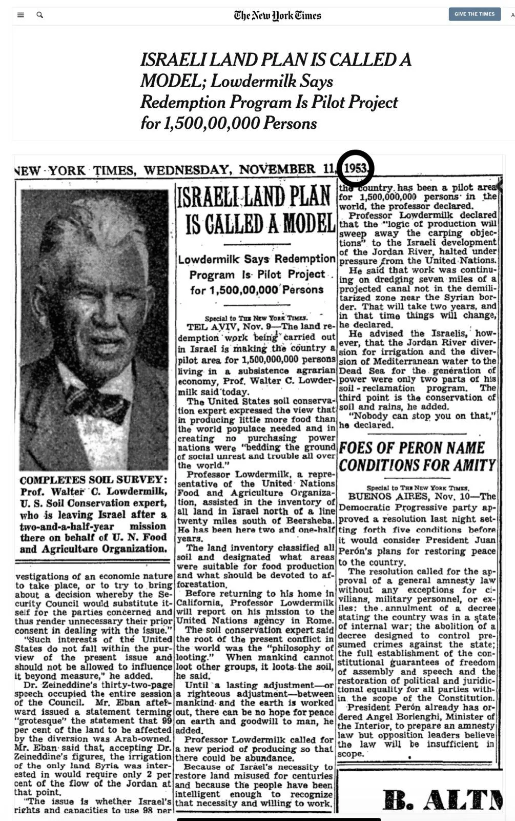 New York Times, 1953: “Israeli Land Plan Called A Model” “US soil conservation expert Professor Walter Lowdermilk Says Redemption Program Is Pilot Project For 1,500,000,000 Persons”