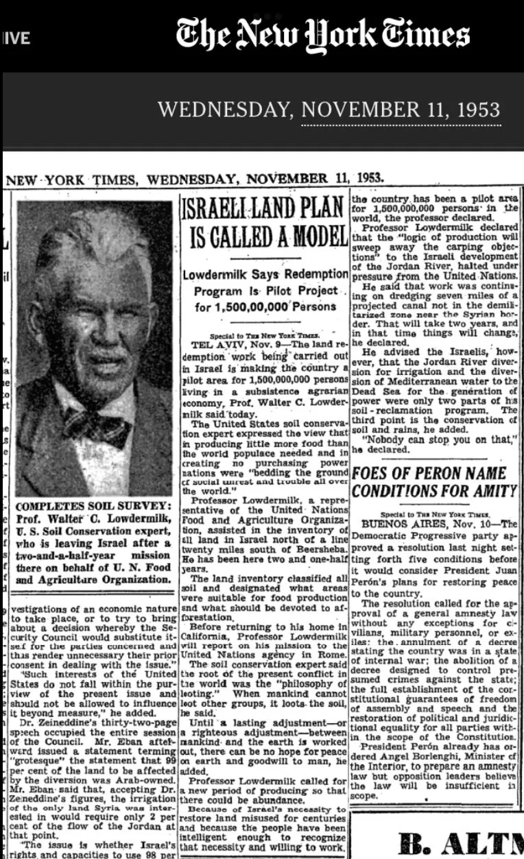New York Times, 1953: “Israeli Land Plan Called A Model” “US soil conservation expert Professor Walter Lowdermilk Says Redemption Program Is Pilot Project For 1,500,000,000 Persons”