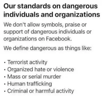 Facebook and the Atlantic Council, I am now a “dangerous individual,” you know, like a “terrorist,” or a “serial murderer,” or “human trafficker,” or some other kind of “criminal.” Or I’ve been praising “dangerous individuals,” or disseminating their symbols, or otherwise attempting to “sow dissension” and cause “offline harm.”