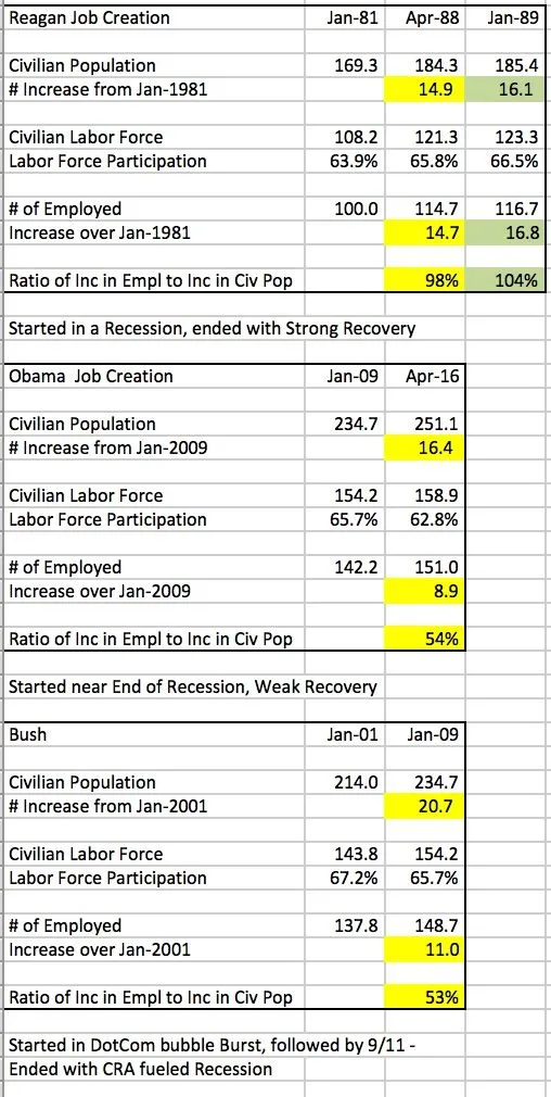 You are a blithering idiot. For the people with functioning synapses and logic functions, here's the analysis of Reagan vs Obama. Reagan created enough jobs to fully employ the increase in the Civilian population. Obama's ratio is slightly above half. Both started their terms in Recessions; Reagan's recovery was far more effective. I've included Bush for a comparison; he ended in a Recession (the cumulative impact of Clinton's CRA and the Dems not allowing Fannie Mae & Freddie Mac to be properly controlled).