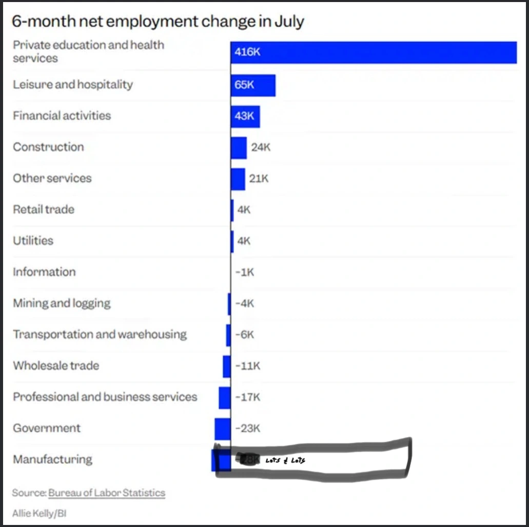 Fake news. I just saw Trump’s staff release these great numbers. The best anyone has seen.Wasn't that the end goal for Trump's tariffs? Domestic manufacturing would make a comeback with more new jobs create here? But so far, it ain't happening. Promises in more investing here have been made, so maybe the numbers will improve. But - when you hit imported steel and aluminum with higher tariffs, the businesses that use steel and aluminum to make washing machines and bicycles and other like products will have to raise prices and the result is lower demand. Hence, a loss of jobs.