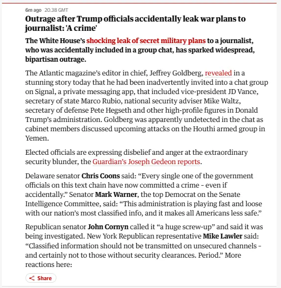 Personally, I loving the pretzel twisting their doing right now. They were dropping red, white and blue shit over HRC and her use of a private server for State Department Business, demanding she be investigated and she resign. There was zero intent on her part, but when Hegseth shares TOP ******* SECRET War Plans on a public chat they are all kinds of forgiving. FOX was all about HRC should be jailed. But now, the silence is truly deafening. Hegseth is a threat to U.S. National Security. He put the lives of American Personnel in danger. Regardless of his intent, he committed a gross violation U.S. National Security and mut pay the price for doing. so.