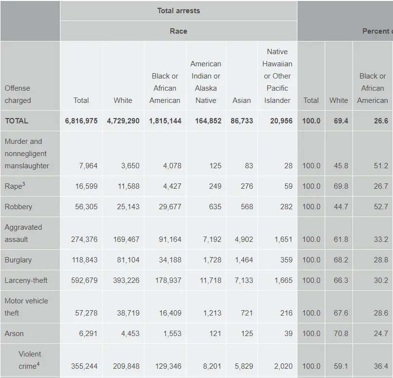 You need to posts links dude. BTW looking at your chart "Murders" Blacks 4,068 (13% of the population) "Whites" 3,650 (over 60% of the population). BS post without links and where are the hispanics?"When you see the majority of violence on our streets is committed by blacks, you have to wonder Where is this pro black bullshit fighting racism shit coming from? Anyone that's lived here knows BLACKS (PC incorrect warning) commit the lions share of crimes. Noticing THAT is deemed "racismistaphobia" by our friendly democratic overlords."