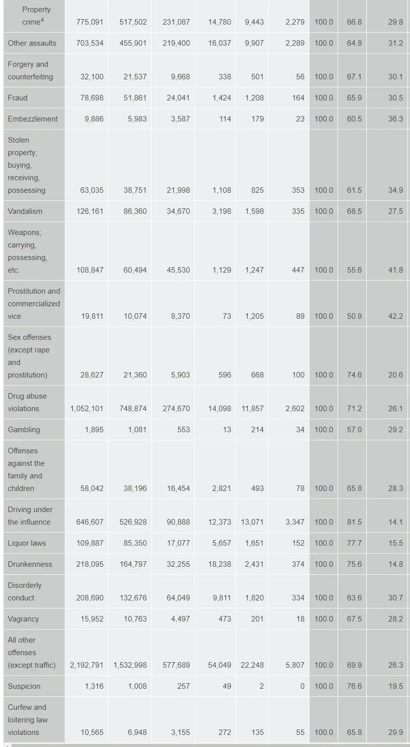 There are 30 categories here. Whites lead in 28. And **** that excuse of there are more of you. Because you raggedy mf's have 15 times the wealth, own the most property, have the most jobs, own the most businsses, control banking, finance and every other American institution. There should be less than 5 percent crime by whites, not 70 percent of those arrested.