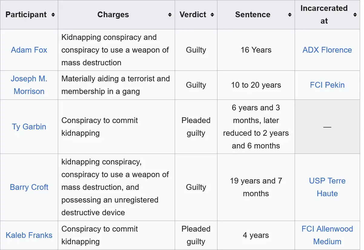 Heck, two of them pleaded guilty to Conspiracy to Commit Kidnapping and are not appealing that I am aware of. Be sure a let us know when Barry Croft gets out of his 19-year 7-month sentence in United States Prison, Terra Haute, for his role in the crime.Thanks for the fascist angle. Heil Hillary.