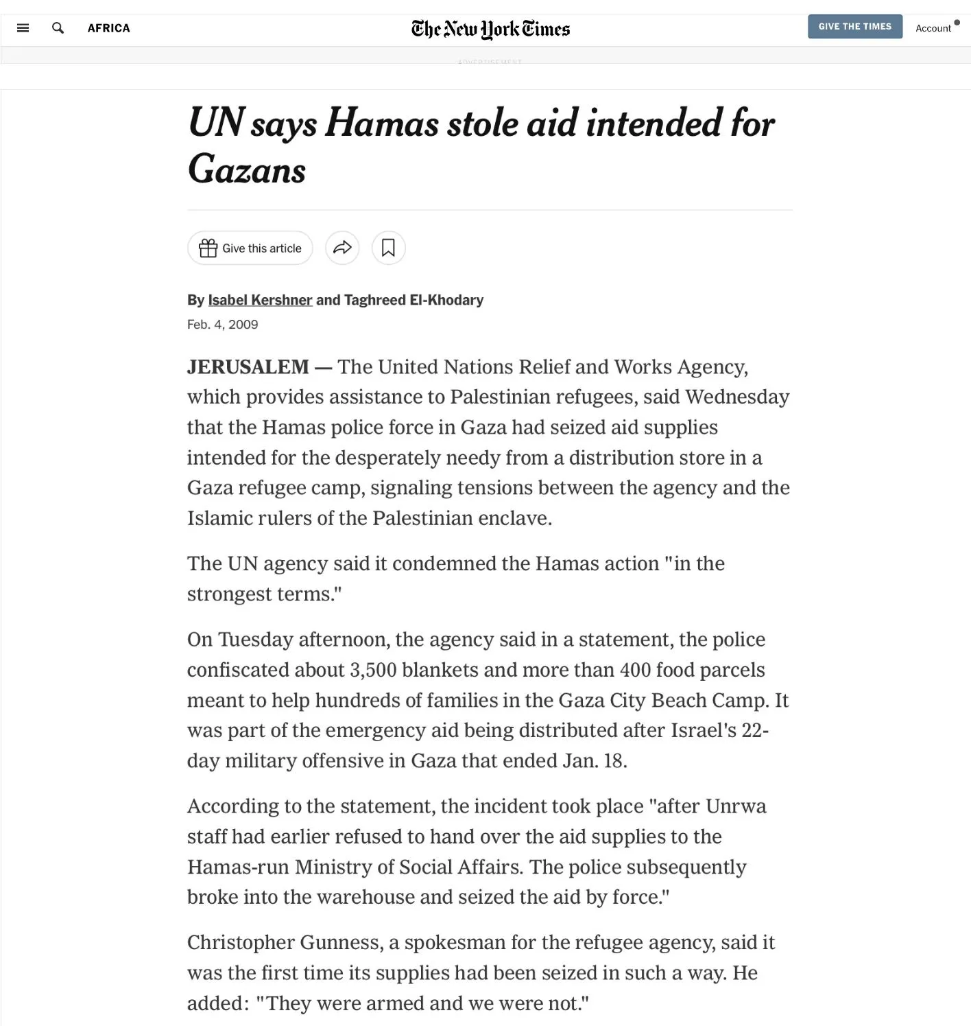 “The United Nations Relief and Works Agency, which provides assistance to Palestinian refugees, said Wednesday that the Hamas police force in Gaza had seized aid supplies intended for the desperately needy from a distribution store in a Gaza refugee camp, signaling tensions between the agency and the Islamic rulers of the Palestinian enclave.
