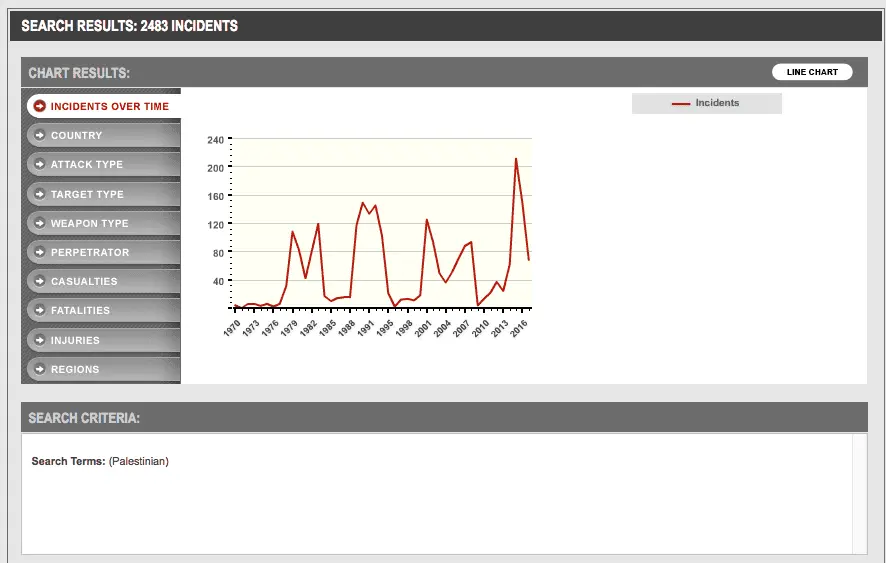 I suggest you use the Gdb on Terrorism rather than make me do a data dump. I'm sure you will find evidence of bombings in public place, the incidents murder in public transportation, aircraft hijackings, aircraft seizures, piracy of a cruise ship, suicide bombings, indiscriminate rocket and mortar attacks, acts of coercion and holding peace for ransom, etc, etc, etc, ...