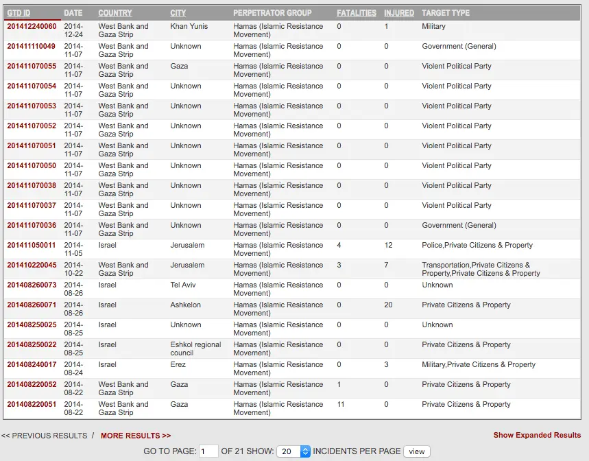 Hell, I can go to the Global Terrorism Database, type in one Palestinian Terrorist organizational Name and draw-up over 400 events (20 pages) of attacks.