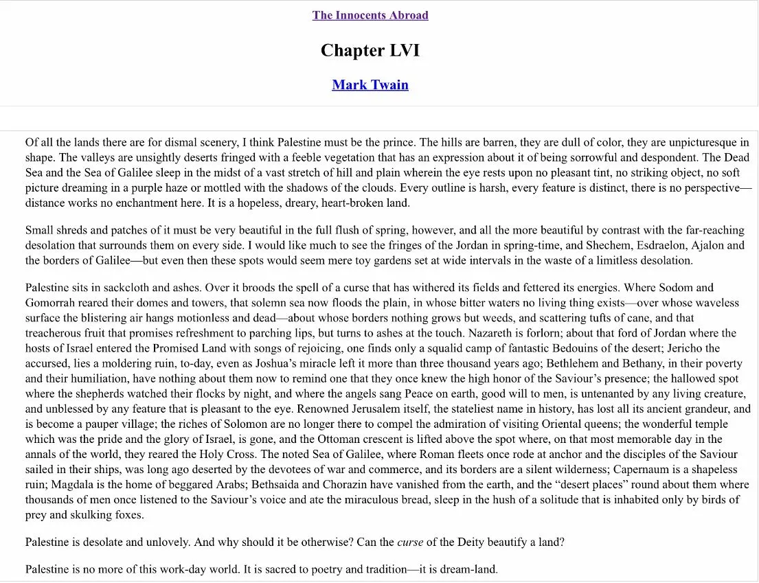 Then, after spending more than 600 pages savaging all comers and making vicious comments about the inhabitants of the lands he visited, Twain concludes, “travel is fatal to prejudice, bigotry and narrow-mindedness, and many of our people need it sorely on these accounts.” It is a wonder that anyone could read this book and take Twain to be a reliable (and unironic) narrator on Palestine in the 19th century.