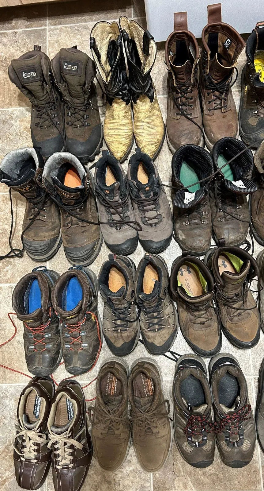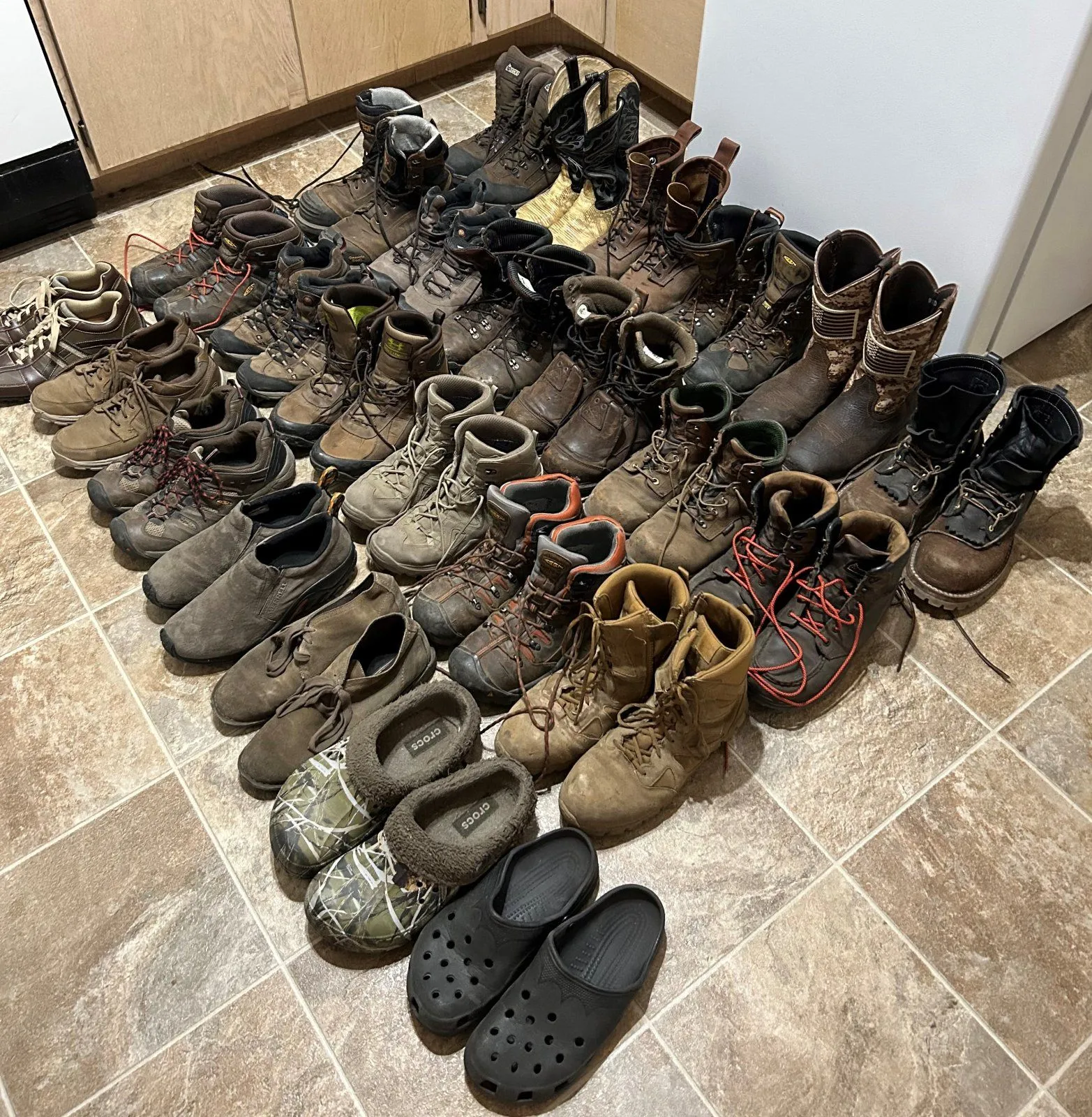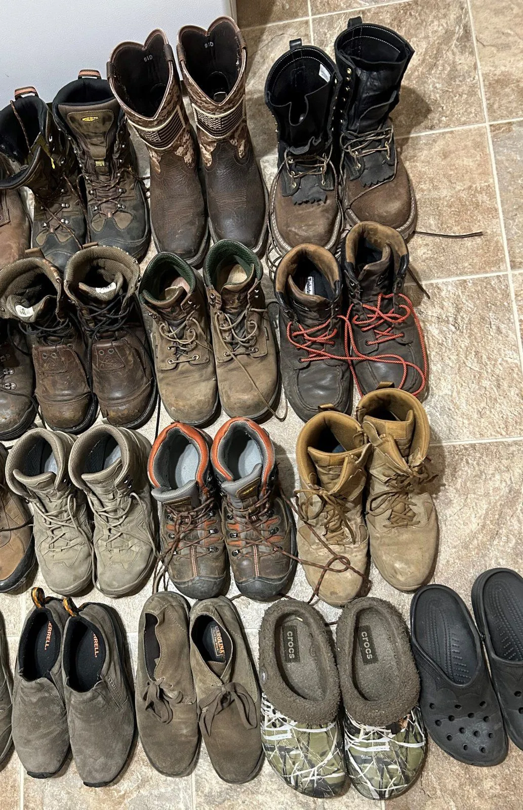 Sorry that I have no fancy shoes to share. I'm a worker first and go casual, otherwise. The only pairs not shown below are my Chippewa Boots, which are still at work, and a pair of Wesco lineman's boots in storage, and a pair of rubber Sorels that I keep in the truck for emergencies (especially in winter). Is there a challenger out there that can beat my shoe collection?