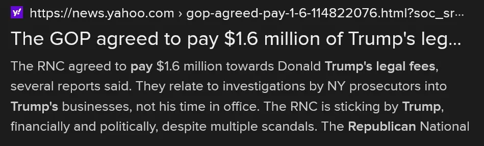 I suspect Donny is indeed guilty as sin, may be indicted, but represented by counsel (probably free to him), would not be tied up, though found guilty in the court of public opinion. I suppose you saw where he had the GOP picked up the tab on $1.6 million of legal fees, for legal situations arising from personal business legal entanglements, totally unrelated to, and before his time in office? Nothing like political donations to allow you to do as you please, on other people's money. You could live like a billionaire.