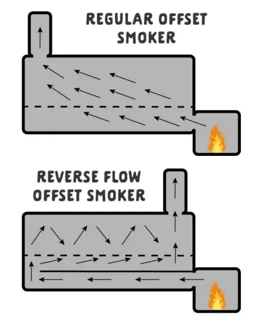 The smoke runs under a plate from the firebox and then reverses course and goes over the the meat and out the chimney. Hot spots are almost completely eliminated and the fat drips onto the 1/4' thick steel plate adding a shit ton of flavor.