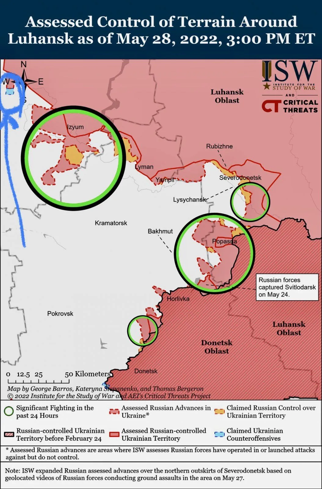 ' 15h: Russian Army and LDR takes Rozsadky, Svitlodarsk, Vozdvyzhenka, Myronivka, Rotti, Vidrodzhennya and south part of Luhans'ke. West of Popasna, they also reach Pylypchatnye, advance in direction of Artemivsk.'