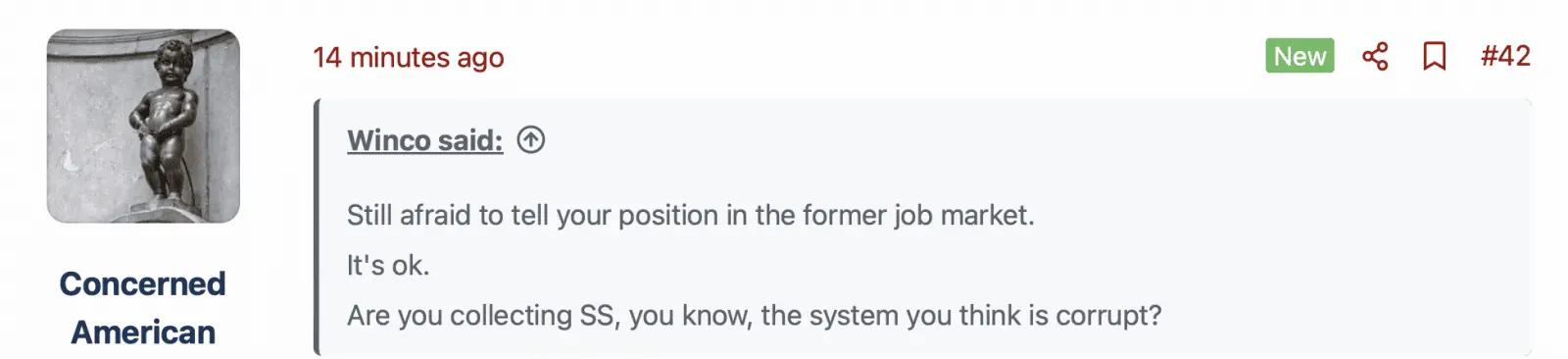 Hey Barney, Still afraid to tell your position in the former job market.LOL, keep talking Winnie, I'm seeing your low self esteem exhibited even as you attempt to disparage me in order to raise yourself up. Maybe you should have a drink and calm down, you're unnecessarily triggered. That happens when somebody has their unsubstantiated position exposed.
