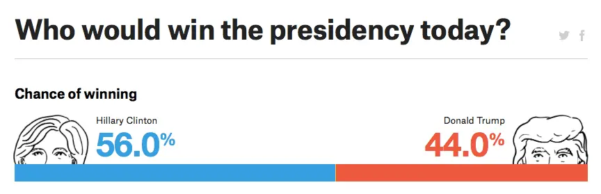 Its obvious that Clinton can't and won't get past what the voters see as being a liar and untrustworthy....Trump just needed to ACT presidential instead of a 5th grader and he has and its swinging his way. He has put Colorado,Maine and Pennsylvania in play all of a sudden 1 state Clinton had pulled out of,1 she never thought he would win and 1 she was up big in!According to Nate Silver, the odds are Clinton 51.8%, Trump 48.2%. There has been a steady trend to Trump for weeks now, and it is clear that unless Clinton scores dramatic wins in the debates, Trump will be president, but Clinton appears to be committed to continuing what has been a losing strategy of talking about Trump rather than telling voters what she will do for them if elected.