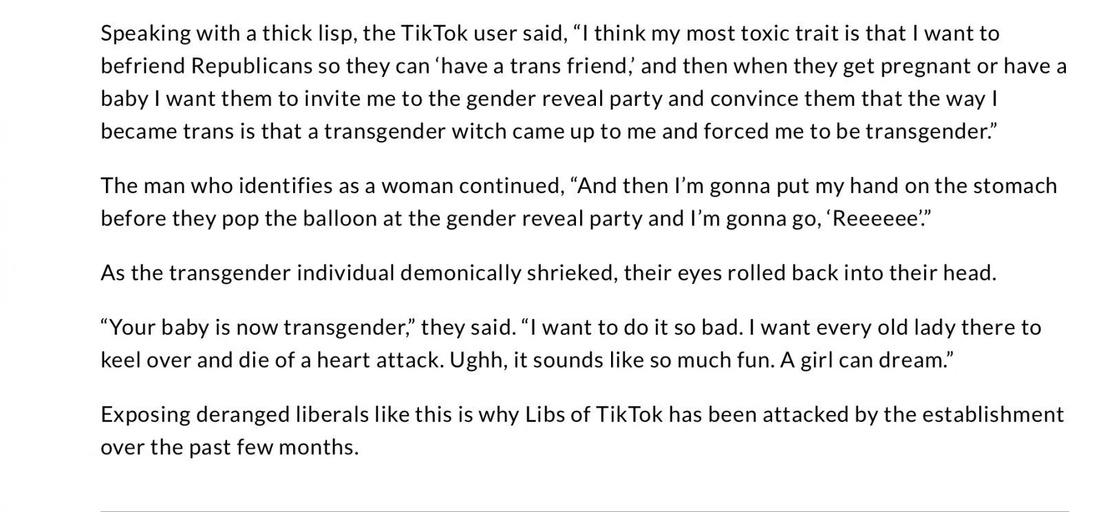 A video posted Monday by the popular Twitter account Libs of TikTok shows a transgender individual expressing their twisted fantasy about putting a hex on the baby of a pregnant Republican mother.
