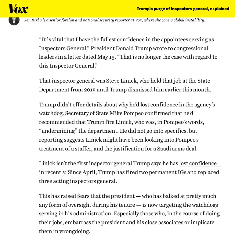 This has raised fears that the president — who has balked at pretty much any form of oversight during his tenure — is now targeting the watchdogs serving in his administration. Especially those who, in the course of doing their jobs, embarrass the president and his close associates or implicate them in wrongdoing.