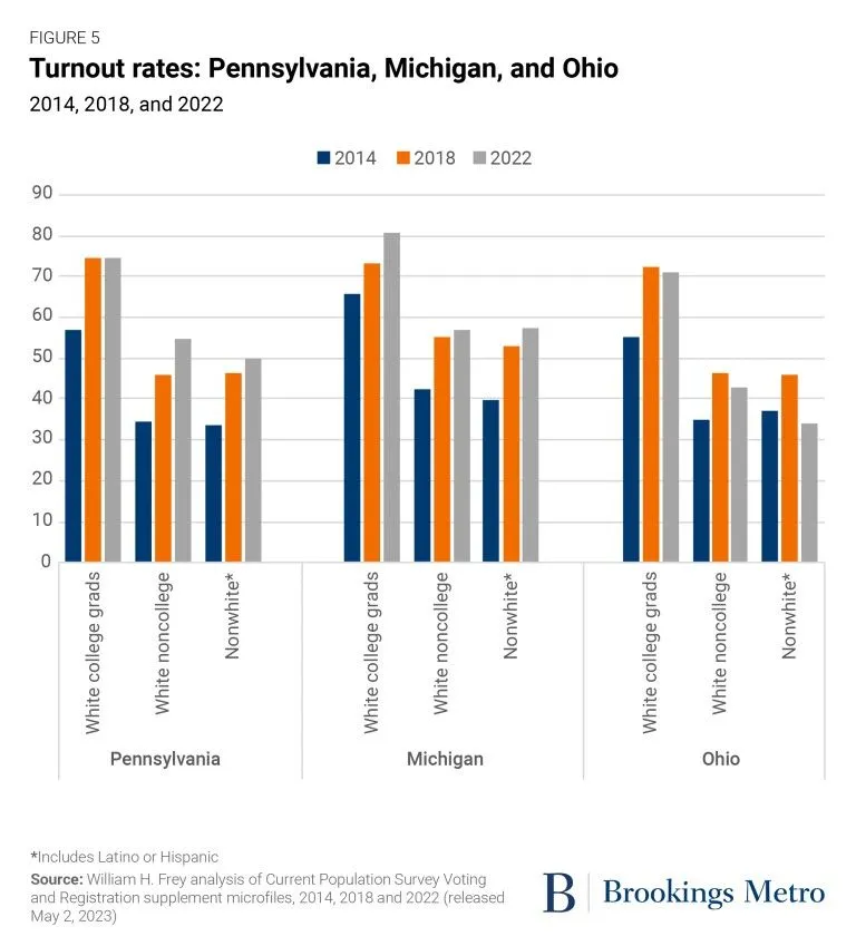 White college-educated voter turnout is far higher the last several years than white non-college educated voters, as this graph for Pennsylvania, Michigan, and Ohio shows.