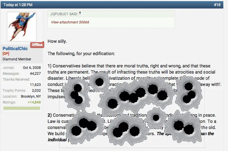 10)Since Liberals see their view as a higher calling that that of Conservatives, they mistakenly believe that it is entirely appropriate for then to use, not logic, facts, nor accepted debating techniques, but ad hominem attacks on the physical appearance, personal history, or imaginary mental defects. Notice how the Liberal replaces intellect with emotion. This is, no doubt, based on a medieval concept of recognizing witches and demons. In fact, Liberals attempt to deal with opponents in similar fashion: recall Clarence Thomas’ “High Tech Lynching.”