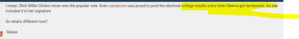 But in the current case, that's the beef... right?Over 50% noAre you drunk this morning? Bill won the popular vote both elections.I mean, Slick Willie Clinton never won the popular vote. Even candycorn was proud to post the electoral college results every time Obama got lambasted. As she included it in her signature