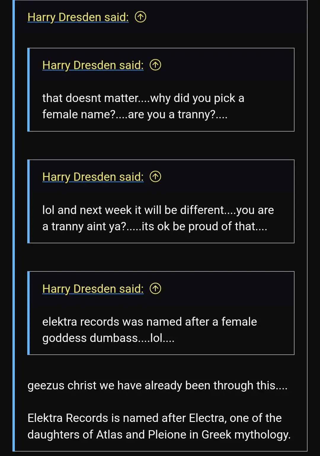 elektra records was named after a female goddess dumbass....lol....Another failing is your intelligence, your ability to reason. You actually believe Jim Morrison was a transexual.